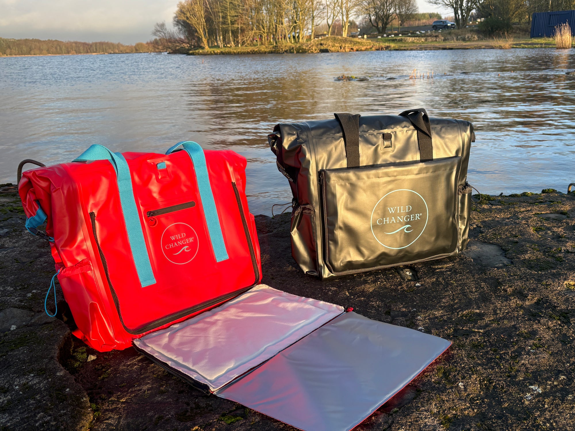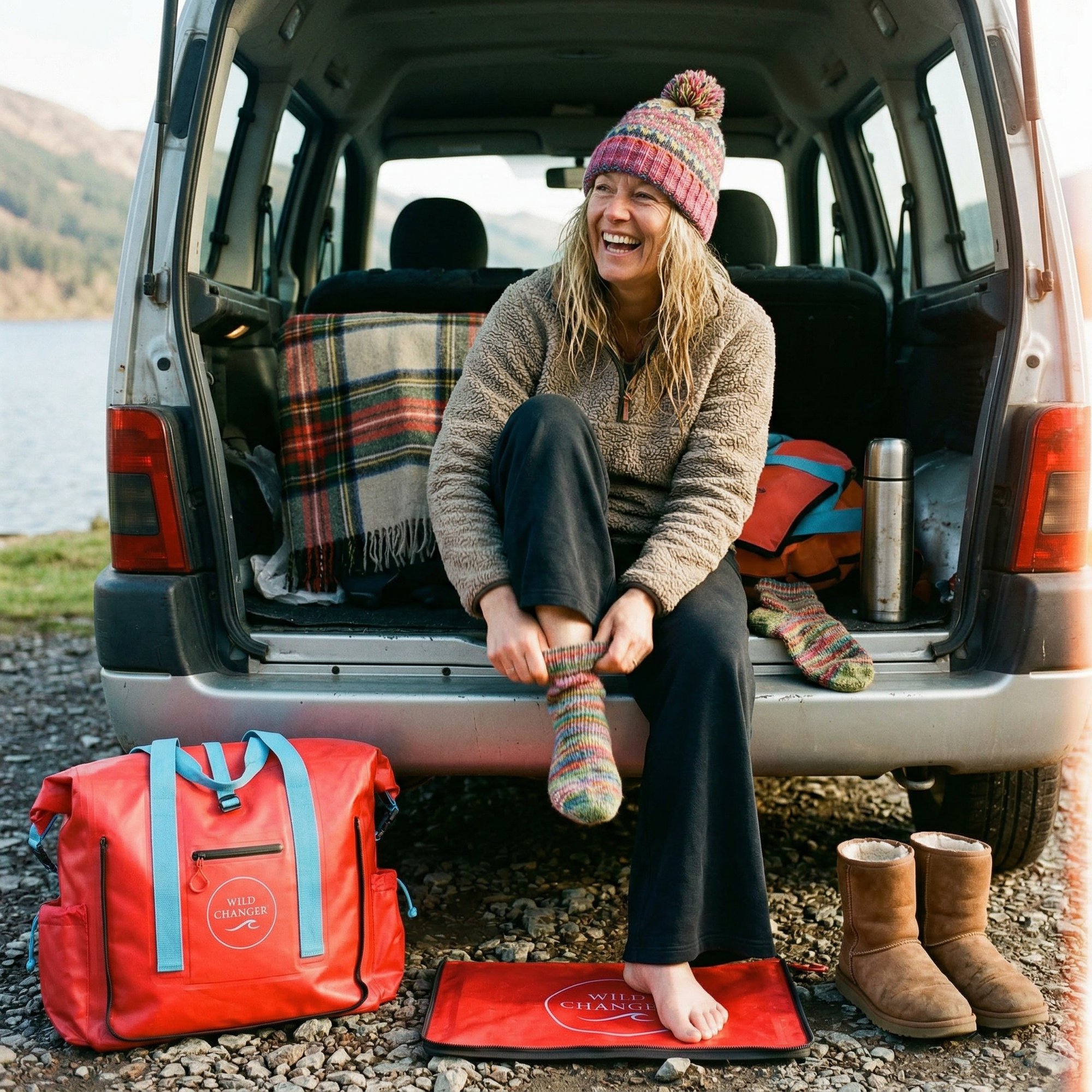 Our bold, bright red Wild Changer. Waterproof, insulated and built around our game-changing two-section mat. Big enough for all your kit, tough enough for Scottish winters, and impossible to lose on the beach.