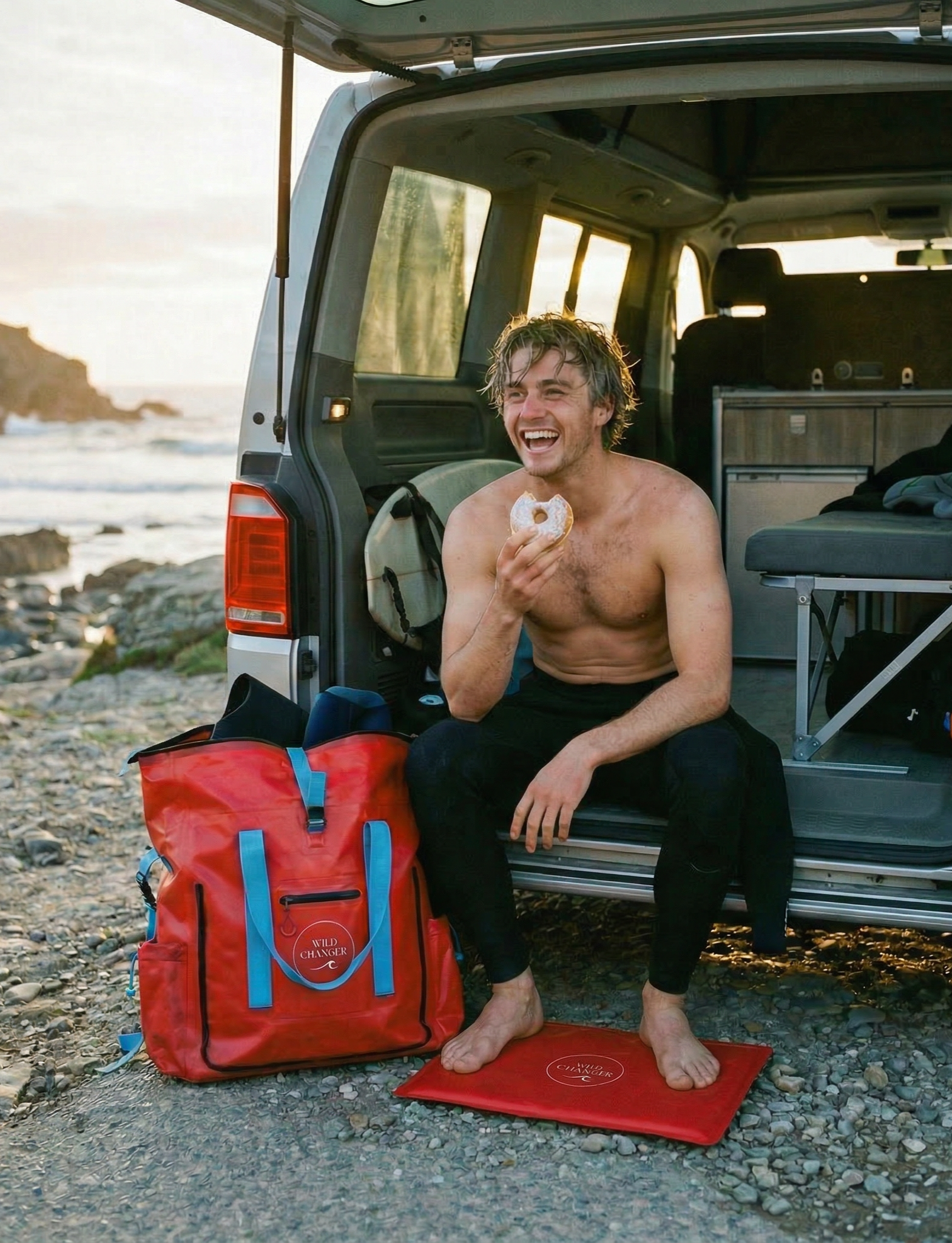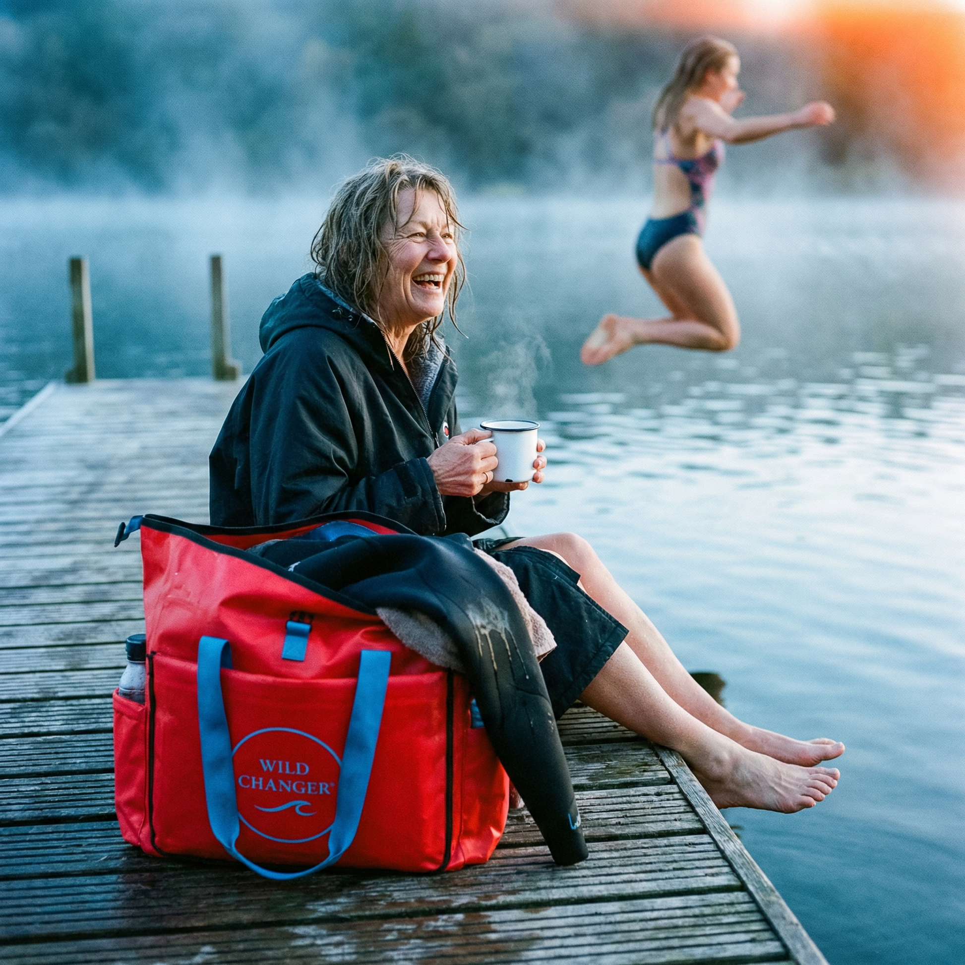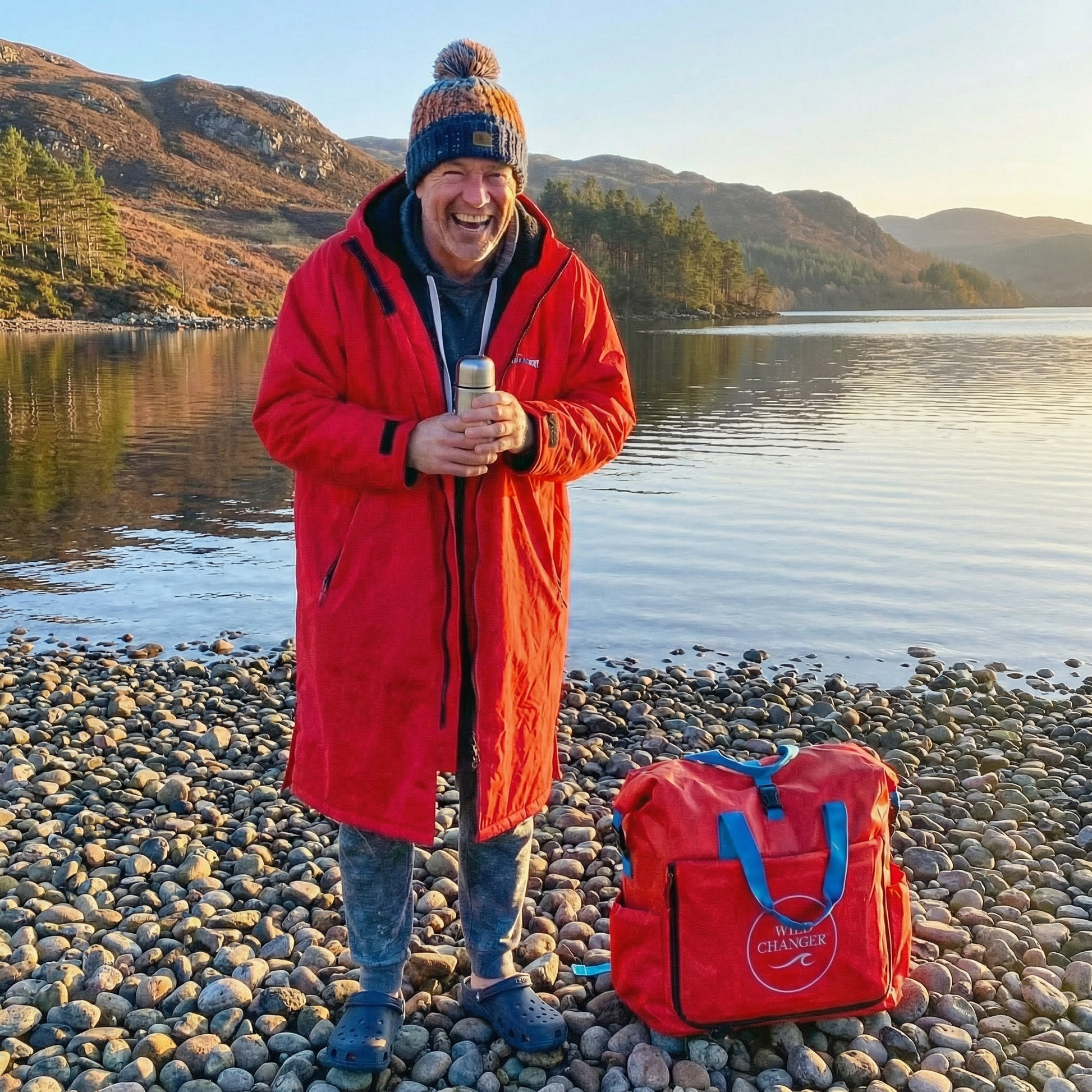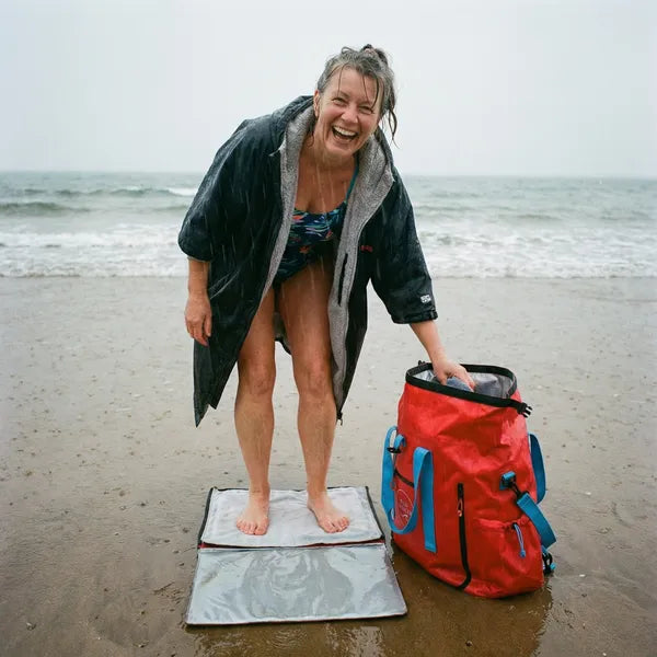The bold red Wild Changer has all the same warmth and clever design, but with one added advantage. It acts as a landmark while you’re in the water. Easy to spot on the shore, even on grey Scottish mornings. You always know where your kit is waiting.